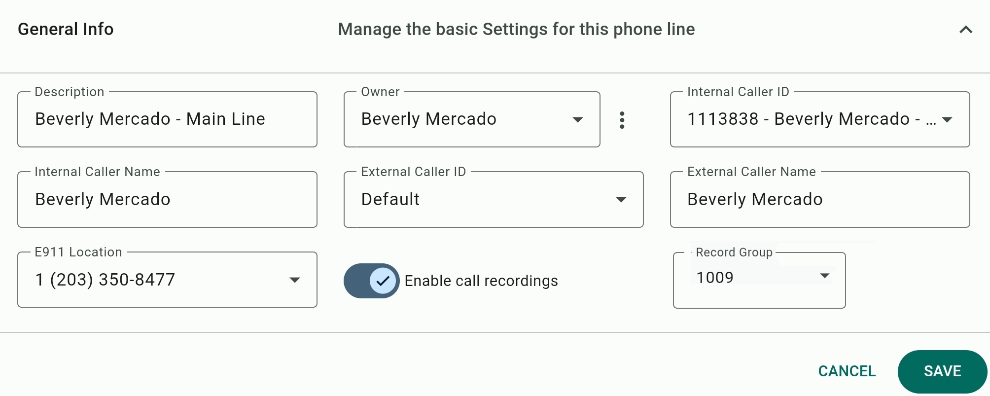 Since the E911 system cannot locate a user based on their internal phone line or caller ID, you need to provide a phone number here that has had a physical address registration for it. This would usually be the main number of your company. Learn more about E911 registration requirements for E911 here. - Enable call recordings/Record Group: This will enable call recording for both inbound and outbound calls on the line.