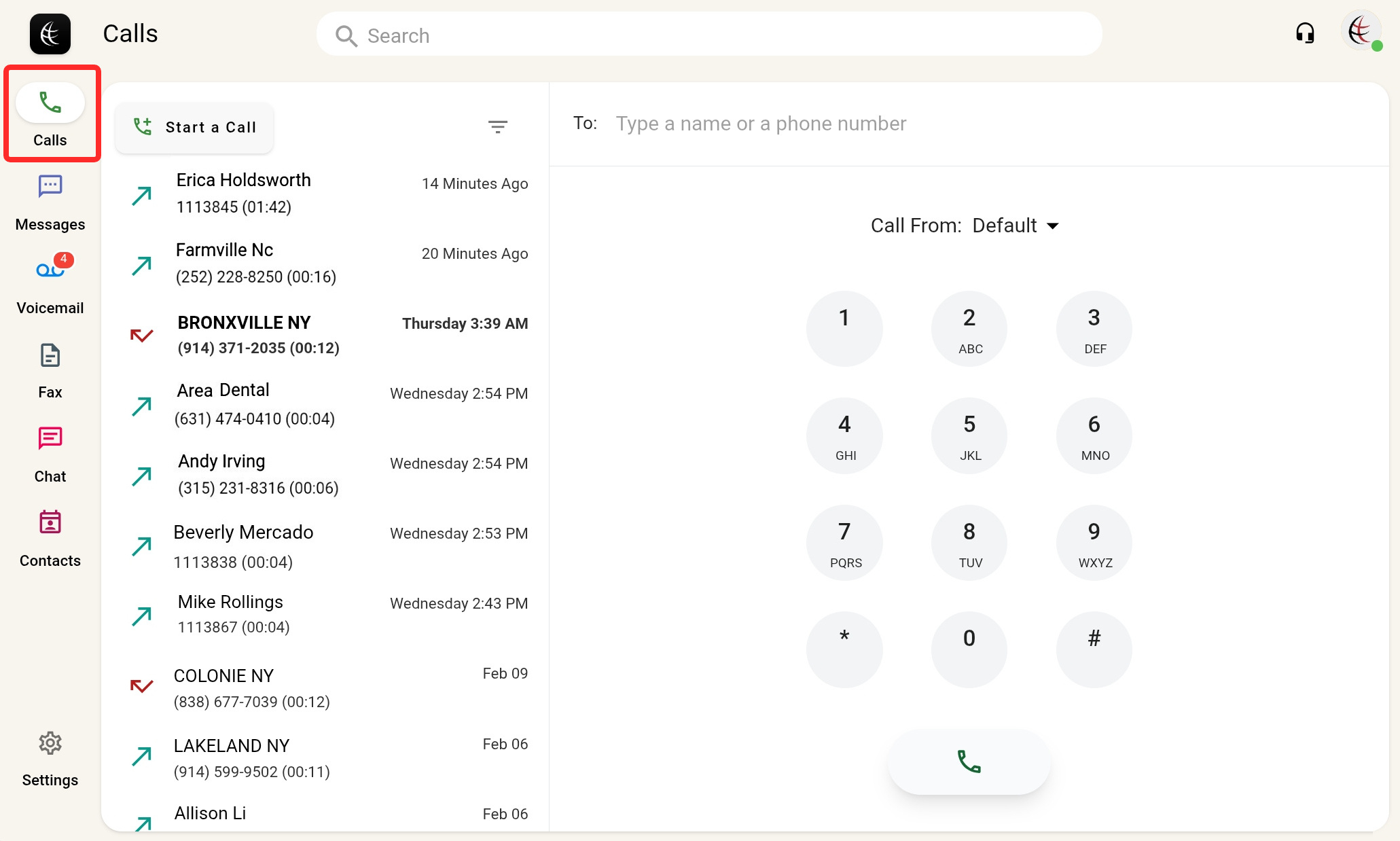 - The left panel displays a Calls Log with your calling history. It has options to filter calls and block unwanted callers. See this article for more details.