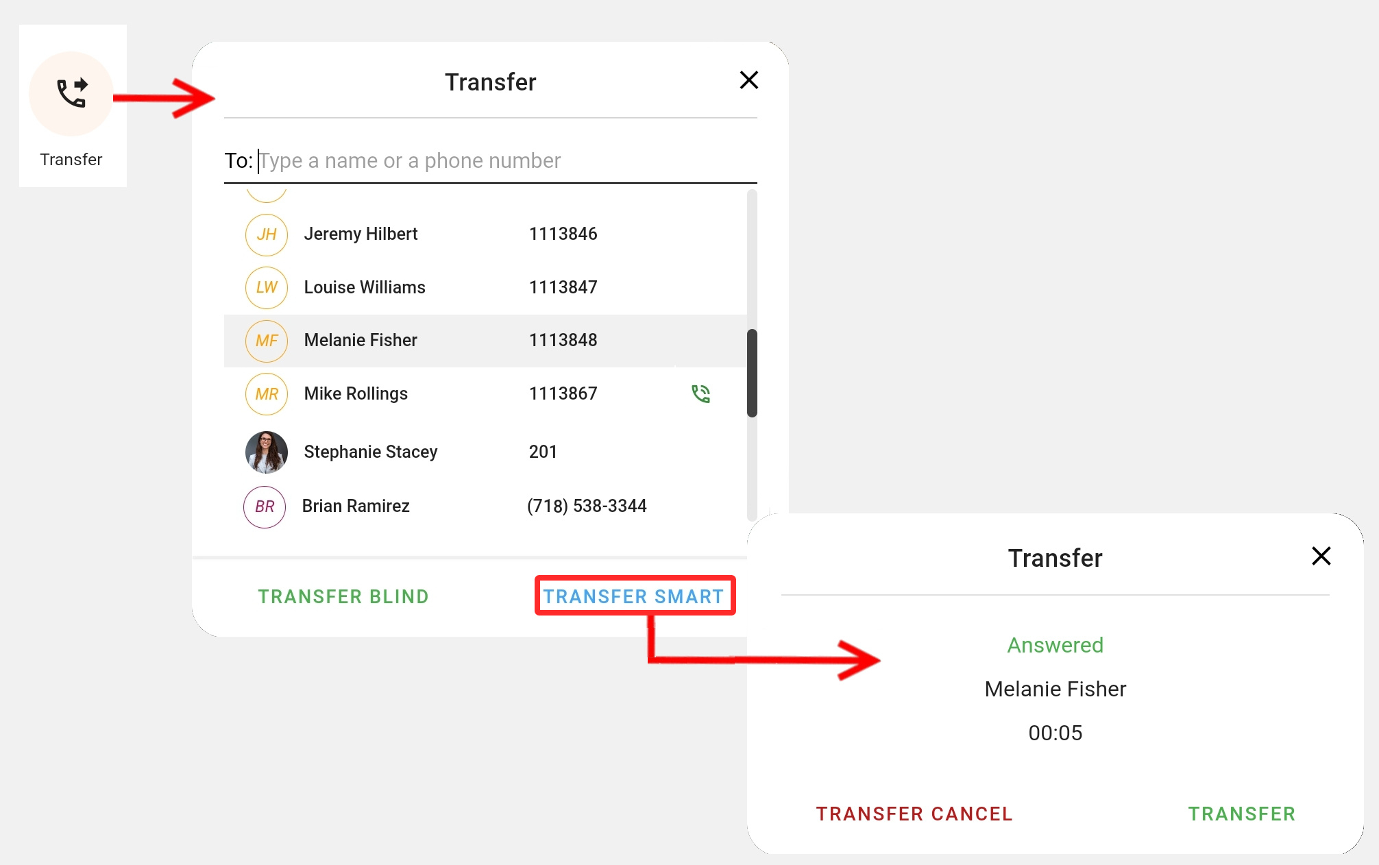 Select Transfer Smart to be connected to the intended recipient first and confirm if they are willing to receive the call (the caller is temporarily placed on hold while you speak to the intended recipient). You can then select TRANSFER to complete the transfer or TRANSFER CANCEL to resume your conversation with the caller.