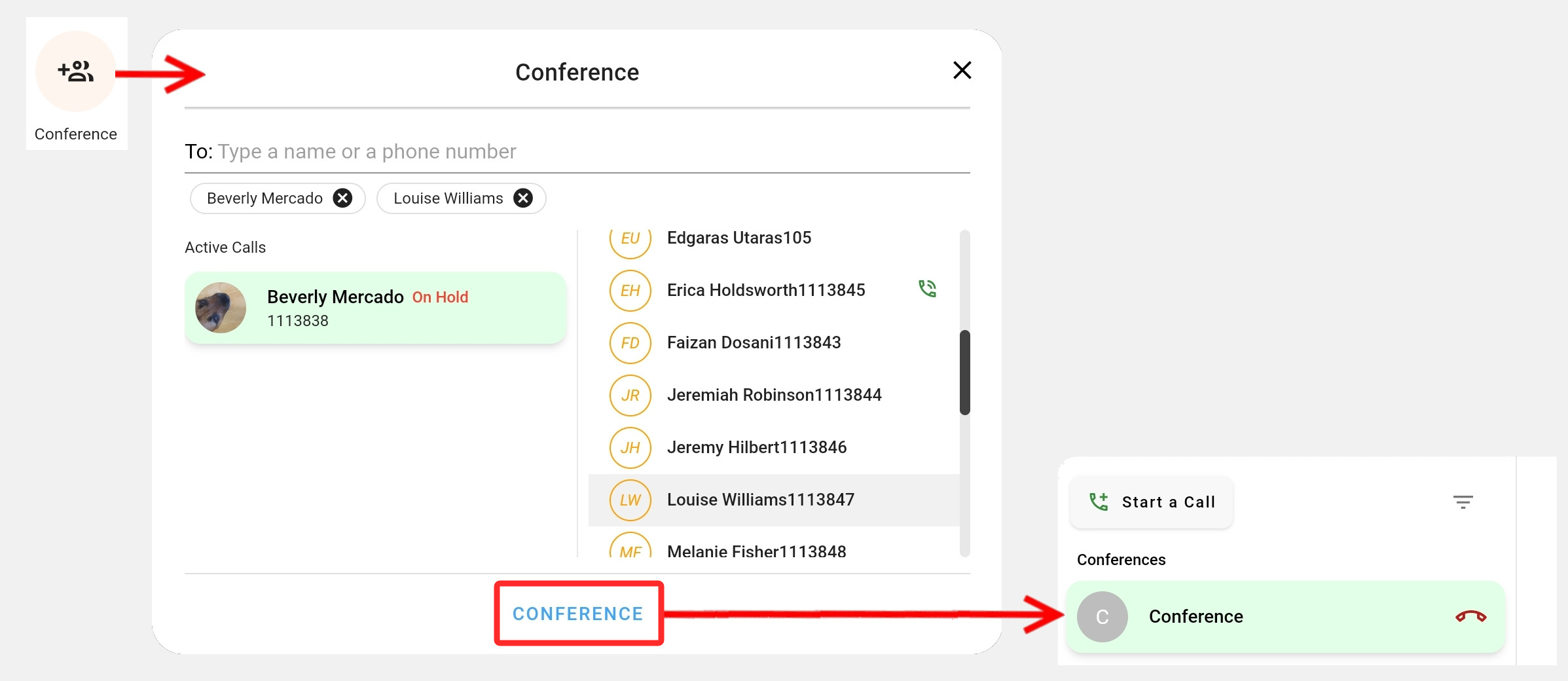 Click CONFERENCE to initiate the conference. A conference tab will appear at the top of the calls log area. Clicking