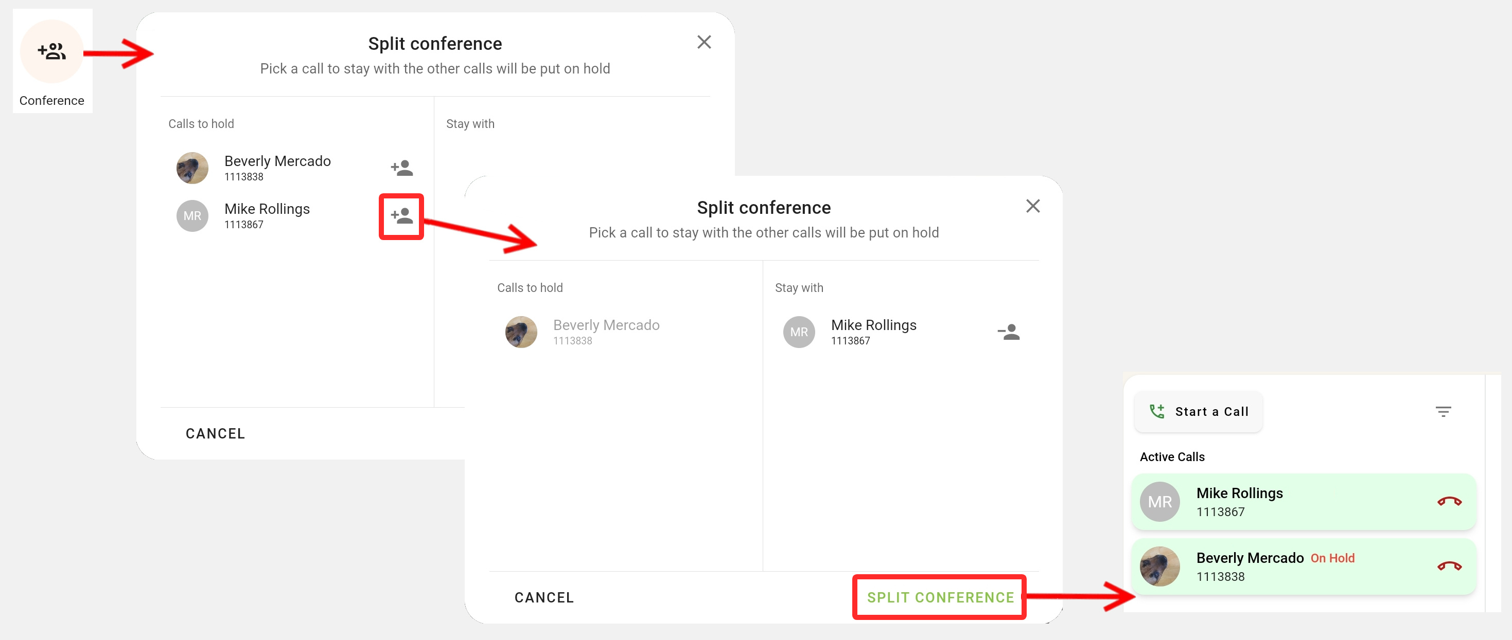 to move it back to the Calls to hold column. Click SPLIT CONFERENCE to proceed.