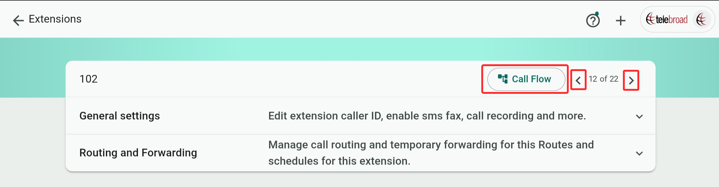 Click the Call Flow button for an interactive flow chart diagram showing a visual overview of how calls get routed from the extension, useful when building or modifying your phone system, and saving you the time navigating through multiple setting screens to see routing details.