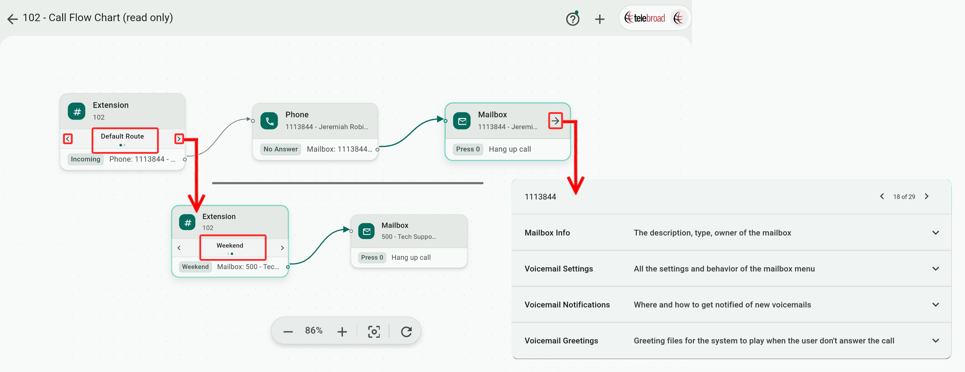Note that if the extension has schedules or caller ID routing, the extension box will show arrow buttons to let you switch the diagram to flow charts for the alternative routing.