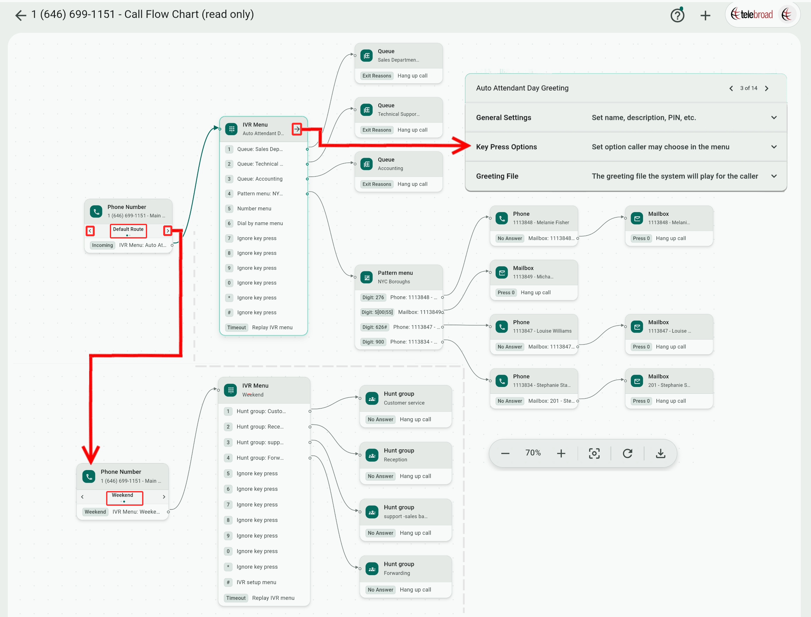 Click the Call Flow button for an interactive flow chart diagram showing a visual overview of how calls get routed from the phone number, useful when building or modifying your phone system, and saving you the time navigating through multiple setting screens to see routing details.