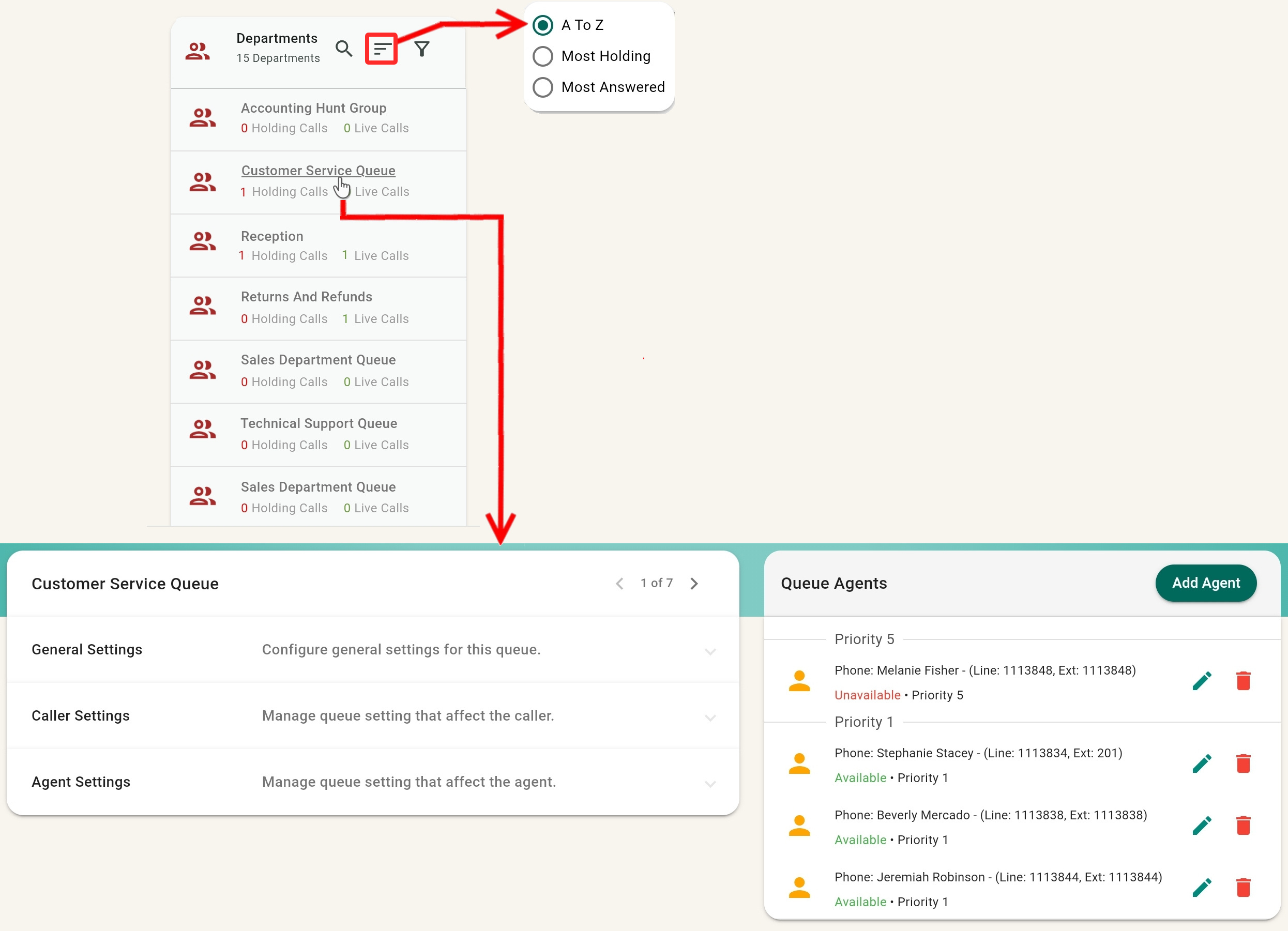 ) the departments alphabetically (A to Z), by the number of Most Holding calls, or by the number of Most Answered calls.