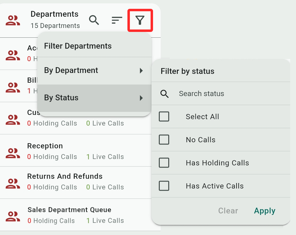 - By Status: Check to show departments by their status – No (holding or active) Calls , or Has Holding Calls waiting to be answered by agents, or Has Active Calls that were answered by agents.