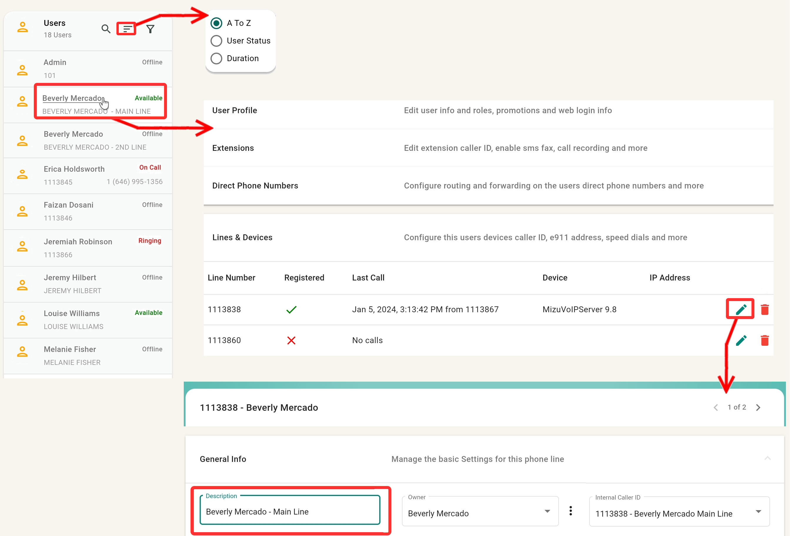 A user's name can be edited in the User Profile settings of that page. To edit the phone line description, expand the Lines & Devices options, click