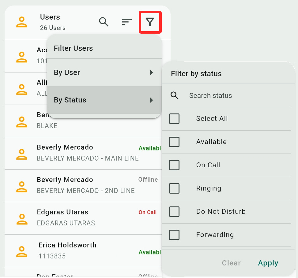 - By Status: Check to show users by their line and call status – Available to take calls, On Call already, their line is Ringing, have enabled Do Not Disturb, have call Forwarding enabled on their line, or have signed out and are therefore Offline.