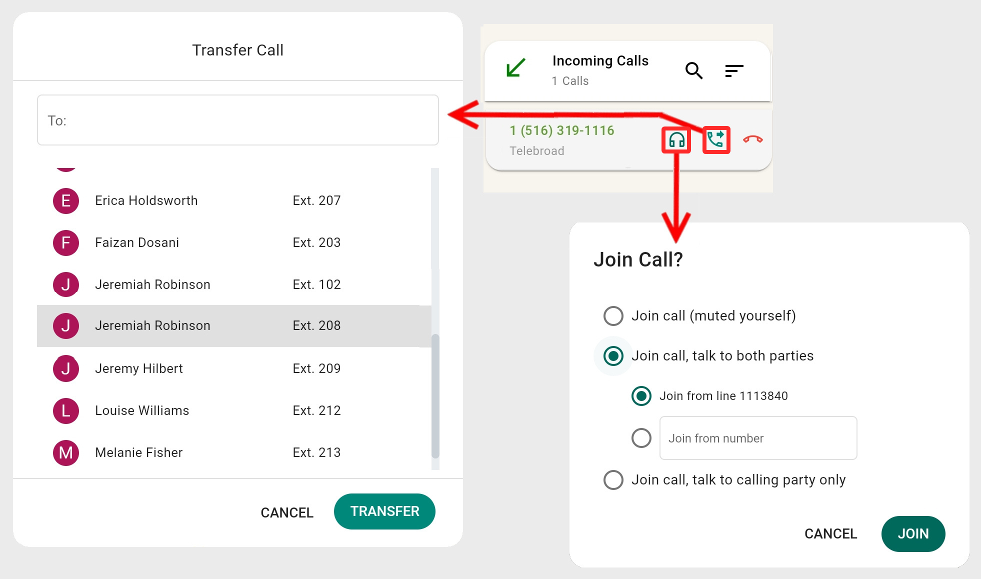 - Join call, talk to both parties: This is like a conference call where you can talk and listen to the other parties and vice versa.
