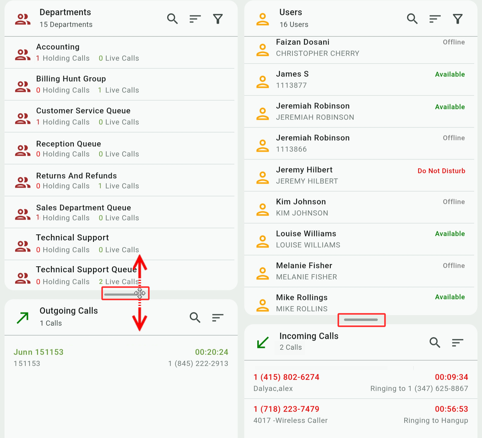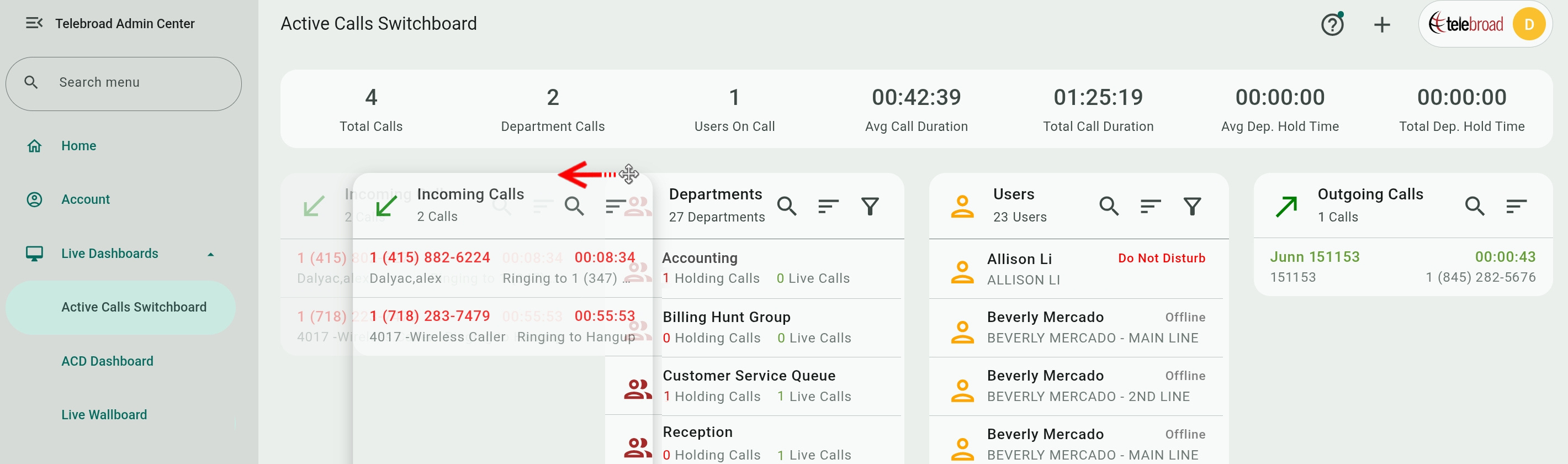 Transferring calls can also be done by dragging and dropping a call over a department or user box.