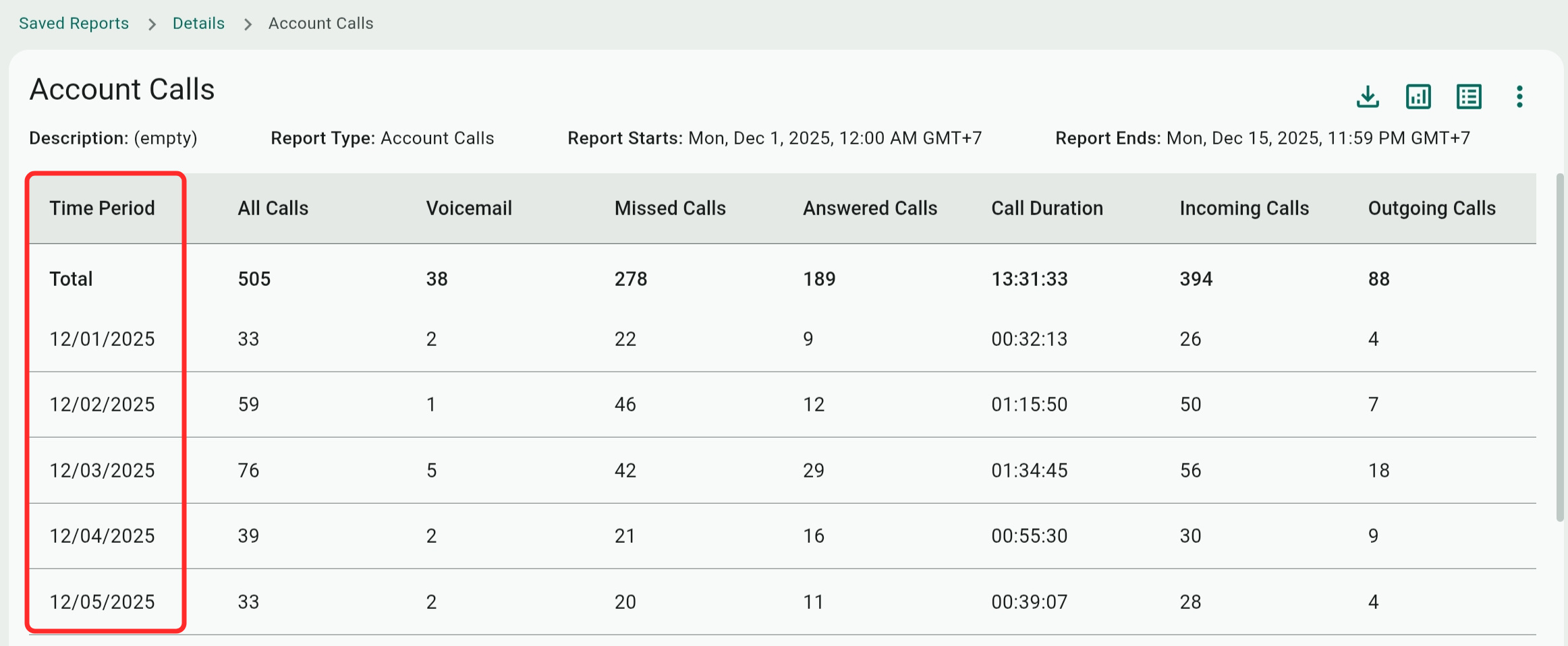 - Sum: For each row, the total sum for each of the same days in the 30-day range is shown. In our example, this means the Sunday row will show a 40-calls sum.