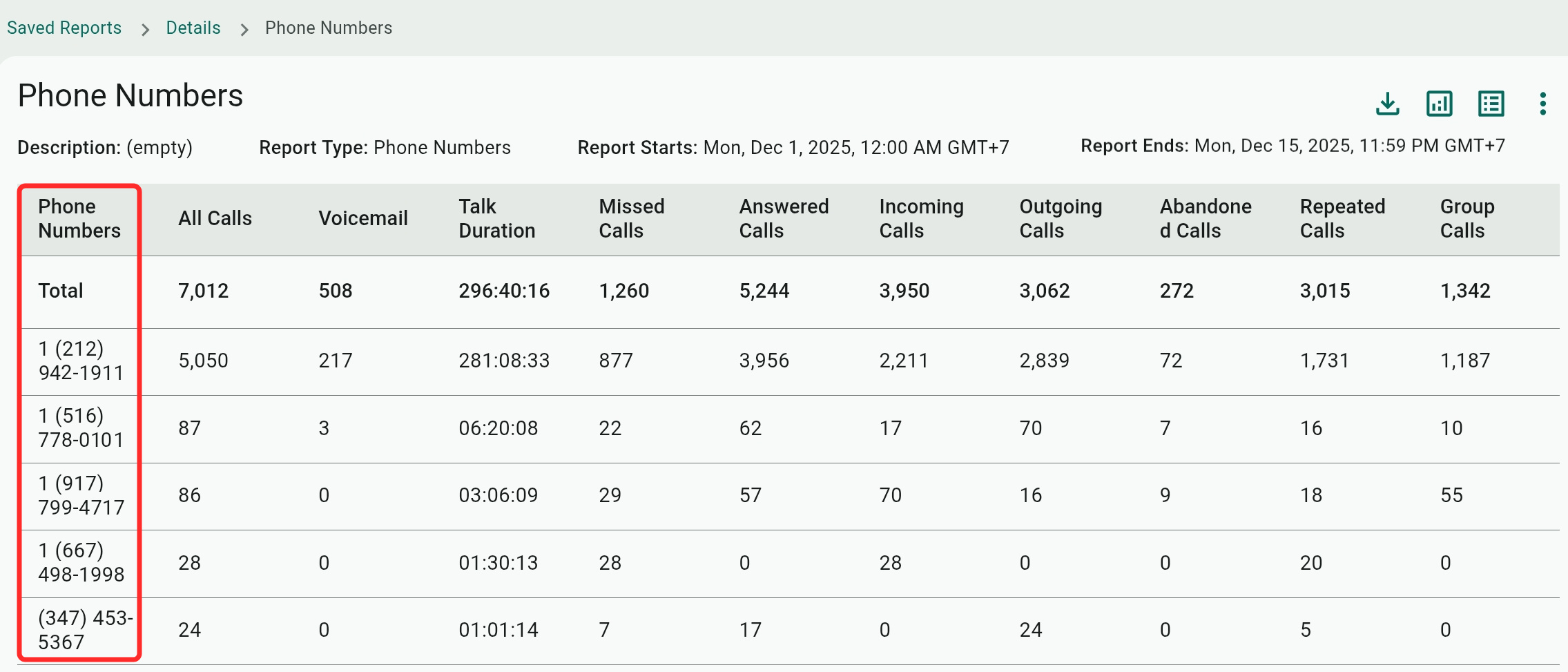 - Phone Numbers Report: Provides details about calls placed or received on your account's external ten-digit phone numbers, which are listed on the first column.