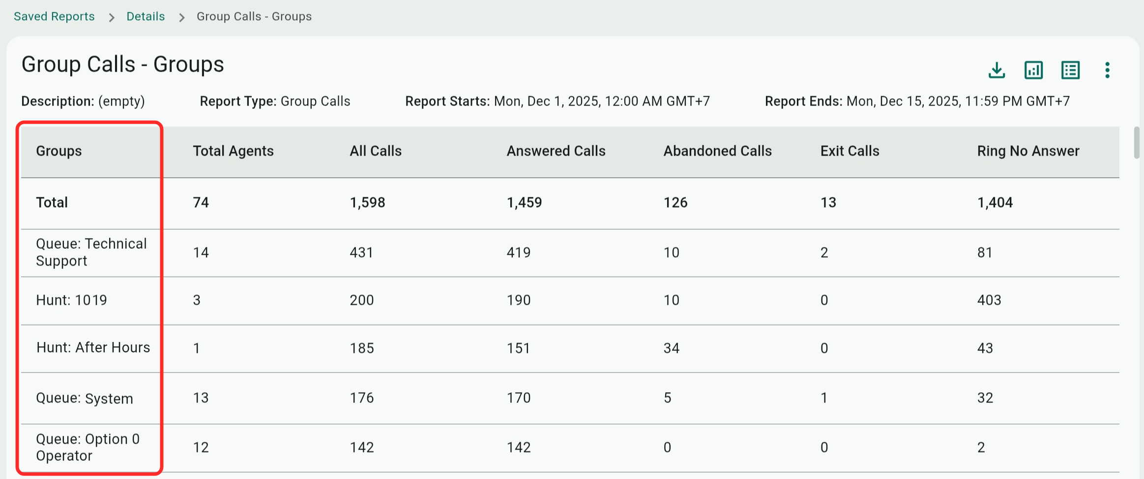 - Groups: Both queues and hunt groups can be selected here.