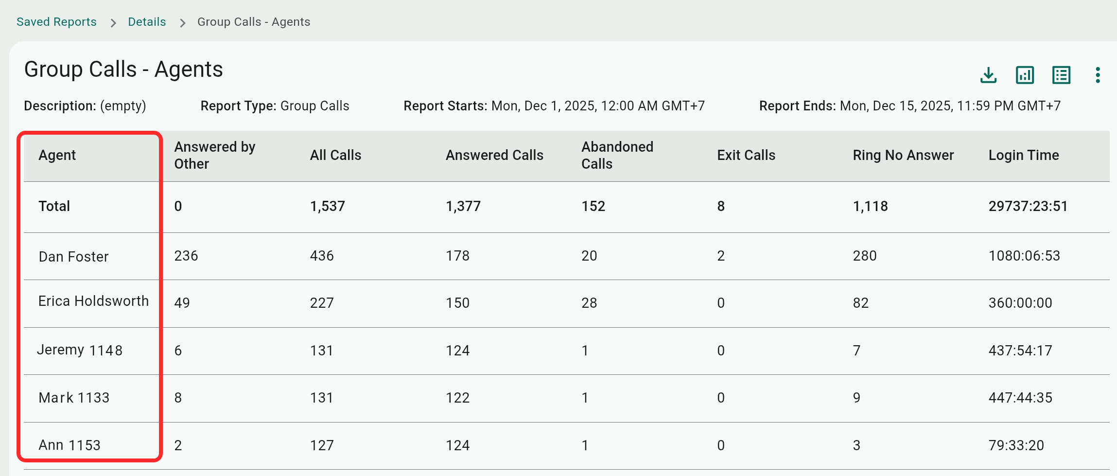 For the Agents view, the first column lists the agents who belong to these hunt groups and call queues in the time range.