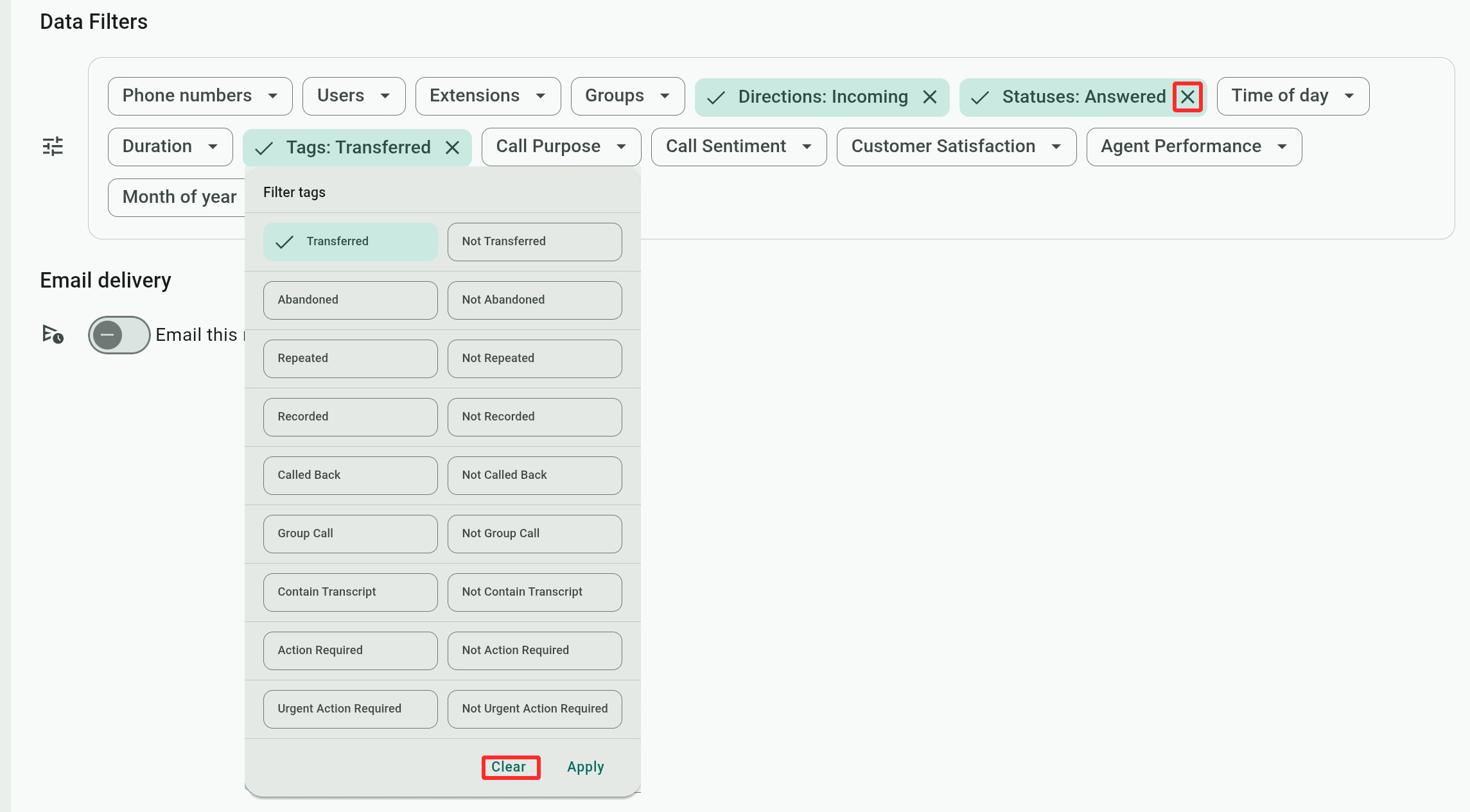 - Add tags: Select call tags that apply to the KPI – Abandoned, Transferred, Repeated, Called Back, Group Calls. Tags are described below in the Data Filters section.