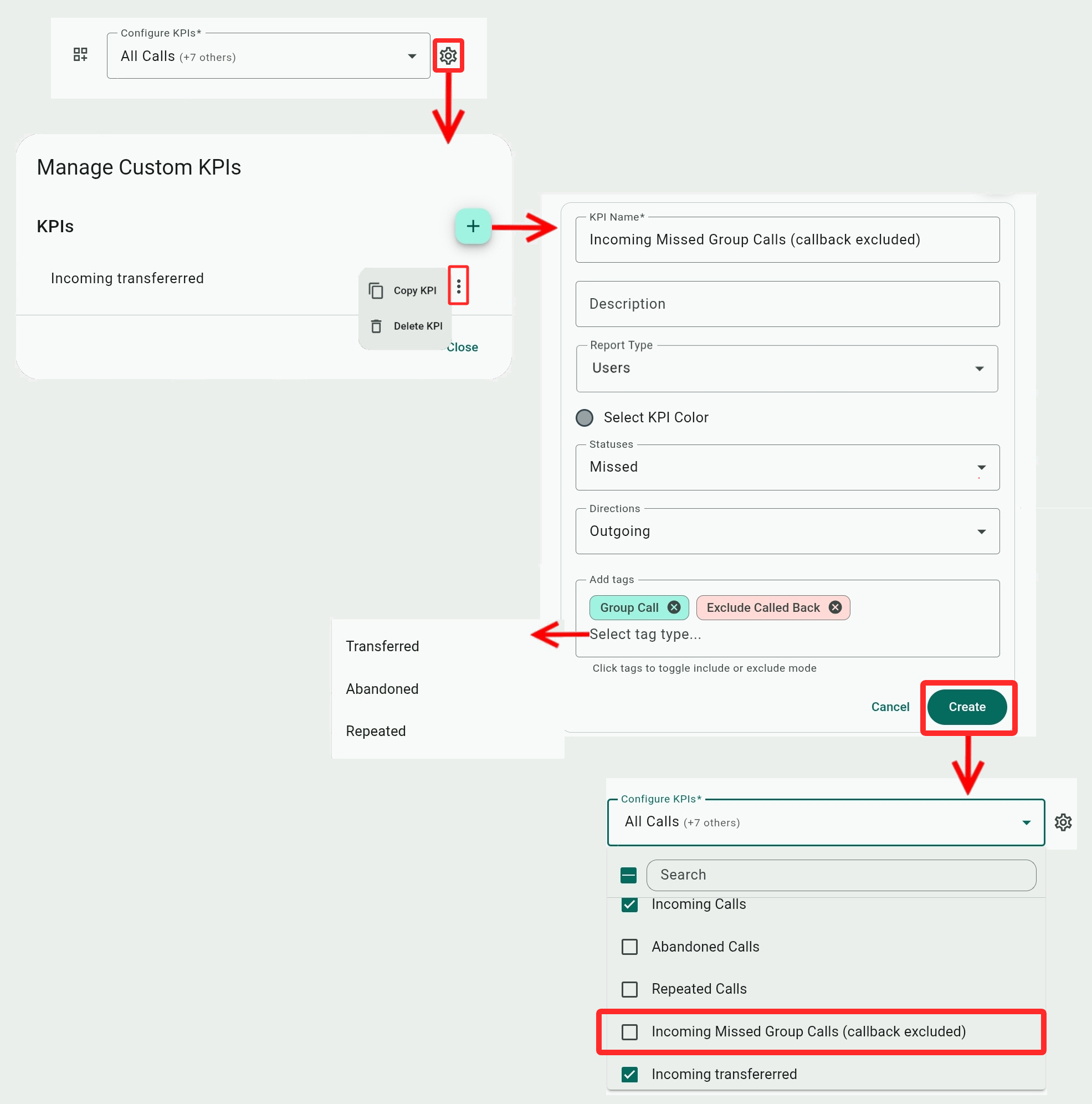 You can create your own custom KPIs by combining several filtering parameters for additional measurement of call scenarios not covered by the regular KPIs. Custom KPIs for call transcripts can also be defined in the Account settings page using AI prompts, as explained here.