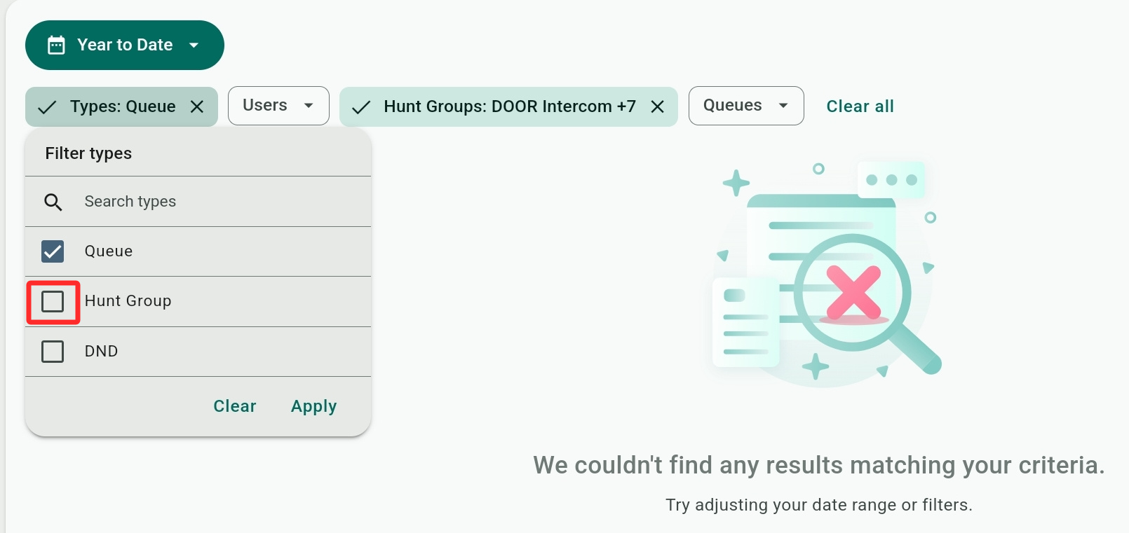 Note that if you select to show hunt groups or queues without including the relevant Type filter, nothing will be shown in the report and you will get an error saying "We couldn't find any results matching your criteria". Fix this by clearing the Type field (so all types are included) or check the hunt group or queue filters.