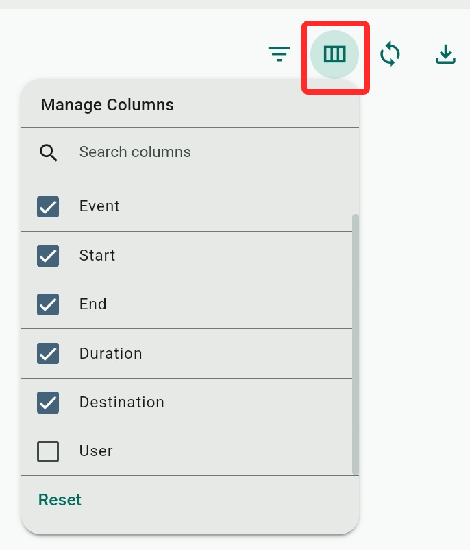Events are displayed under the columns you check or uncheck in the Manage Columns menu.