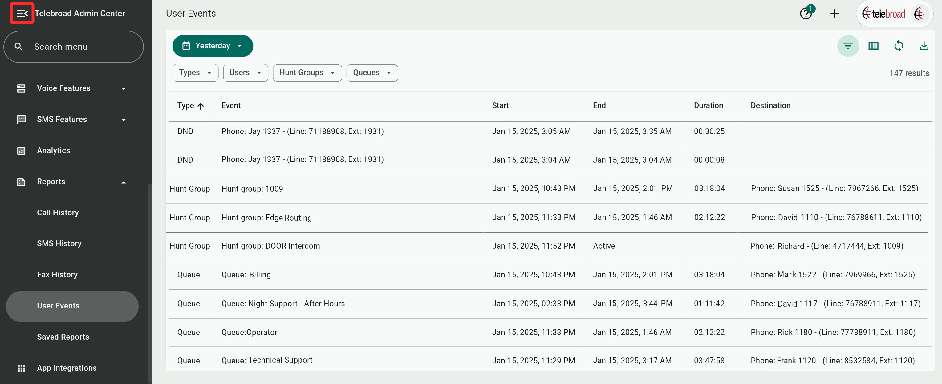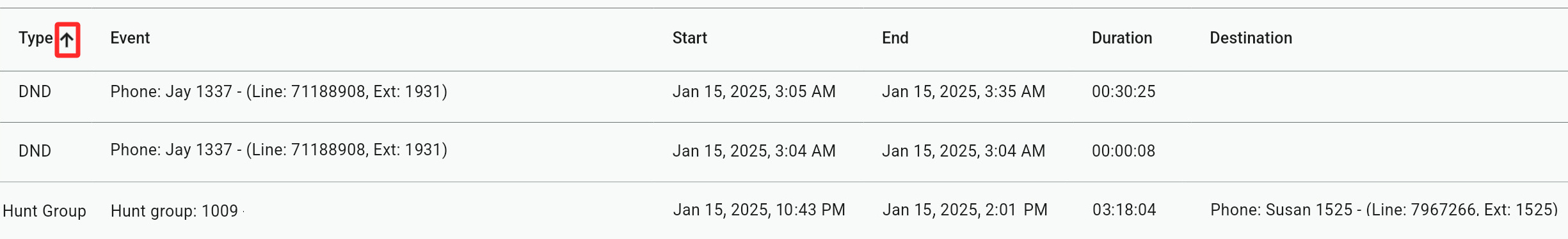 - Type: The type of the event – DND, Hunt Group, or Queue.