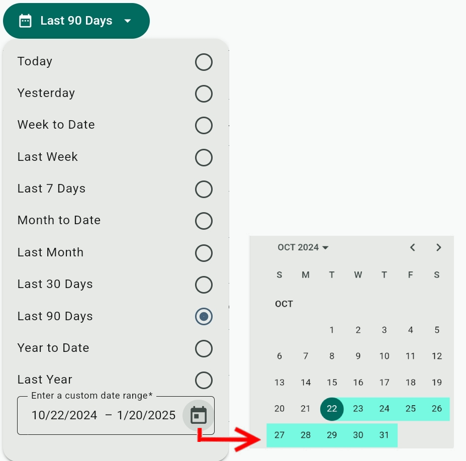 You can also use the Enter a custom date range field to select a date range of your choice. Click the date to enter the date manually with your keyboard or click