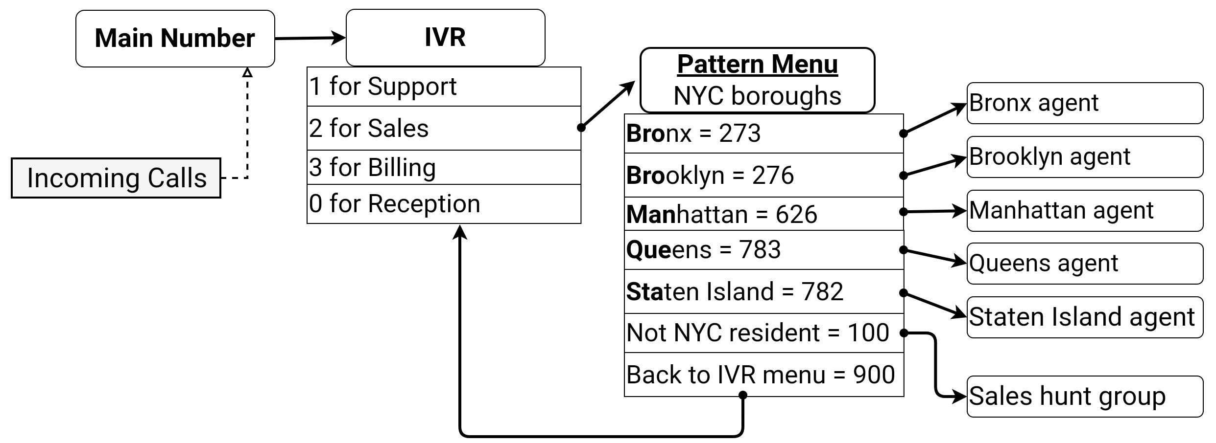 In the example figures, we have a pattern menu that recognizes New York City boroughs and routes calls to an agent handling the borough's customers. Pattern menus have similar functionality to IVR menus, but can handle more complex input than IVRs' single-digit key presses. In the example, we use both with the IVR routing sales calls to the pattern menu, which in turn routes them to the relevant agent.