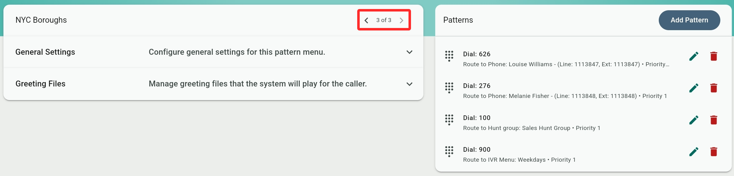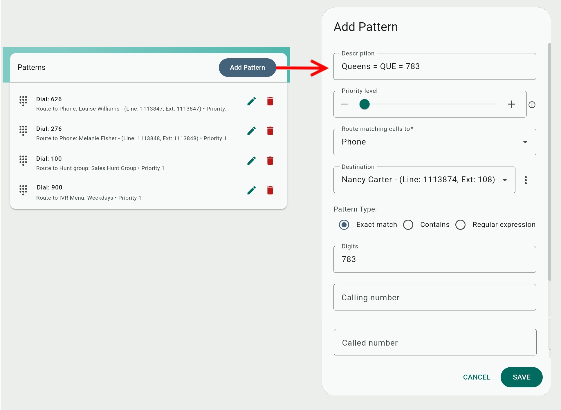 This is the list of patterns that can be identified by the pattern menu and route calls accordingly. Select a pattern or create a new one by clicking Add Pattern to show the pattern options.