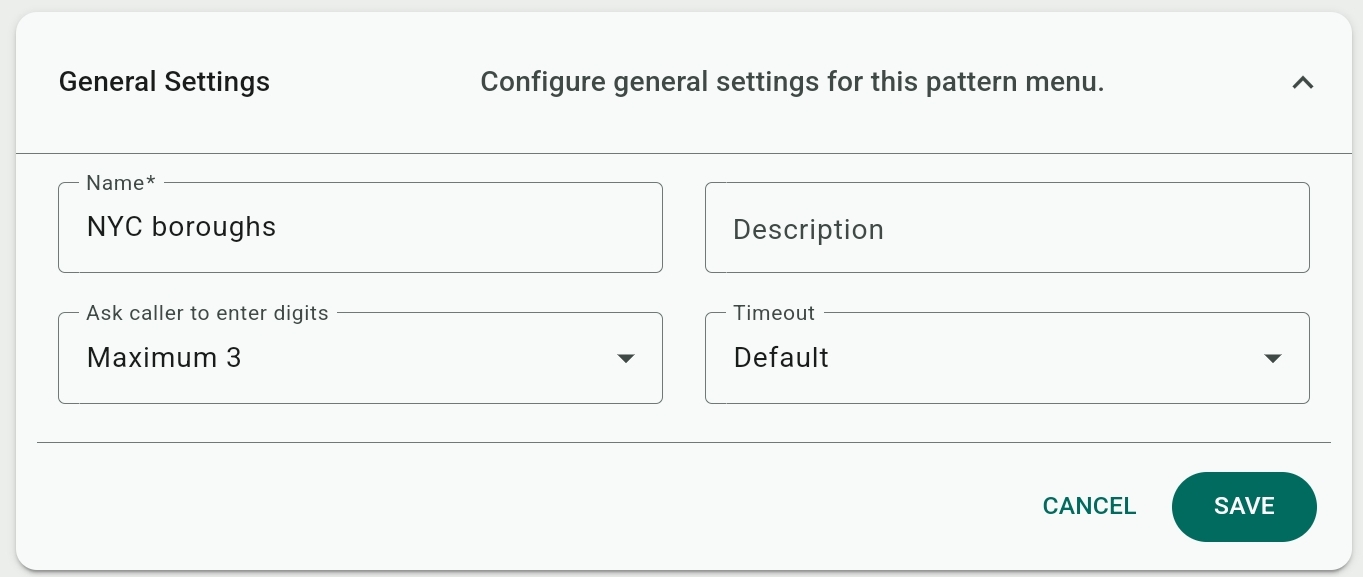 With Pattern Menus, you can prompt a caller to enter a sequence of digits (a pattern) on their keypad and route the call accordingly. Calls can also be routed based on the phone number of the caller or the number they dialed.