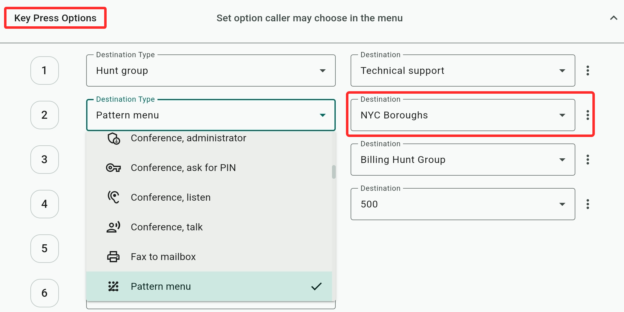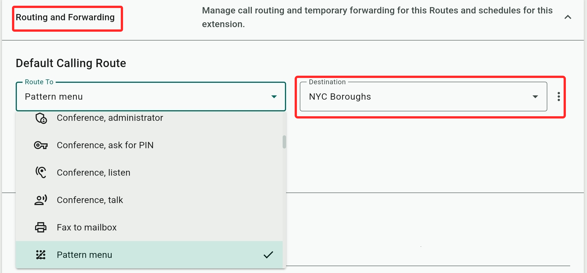 The Admin Center's list of routing options and features is discussed here. Not all routing options require a destination because some, like "Hang up call", "Busy tone", "Music", etc. function as a destination by themselves. - Pattern Type: This tells the system how the pattern is matched to the caller's input.
