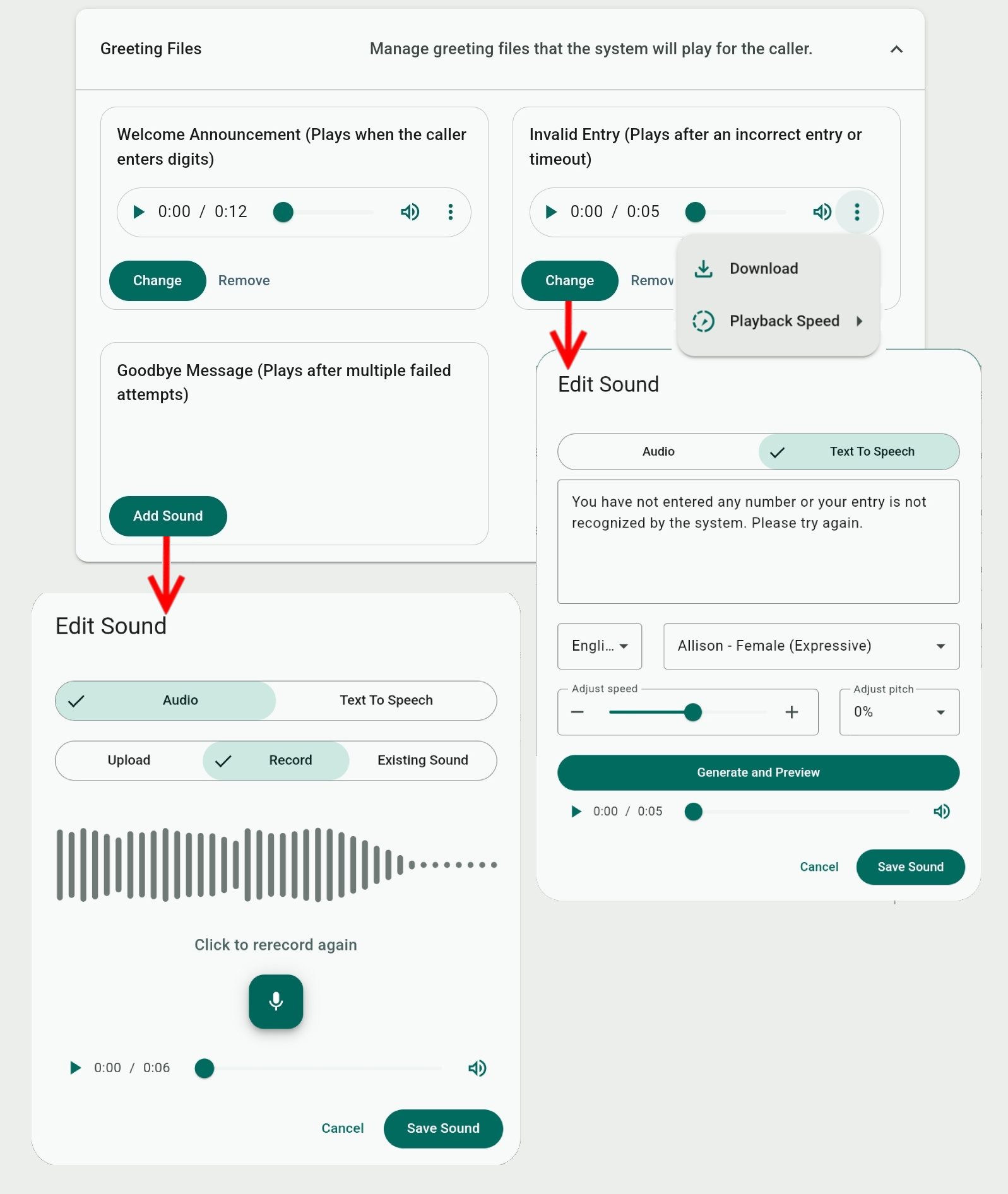If a greeting has not been assigned yet, you can select Add Sound, otherwise you can Change an existing greeting or Remove it. Use a greeting's audio player to listen to it and click the mini-menu (