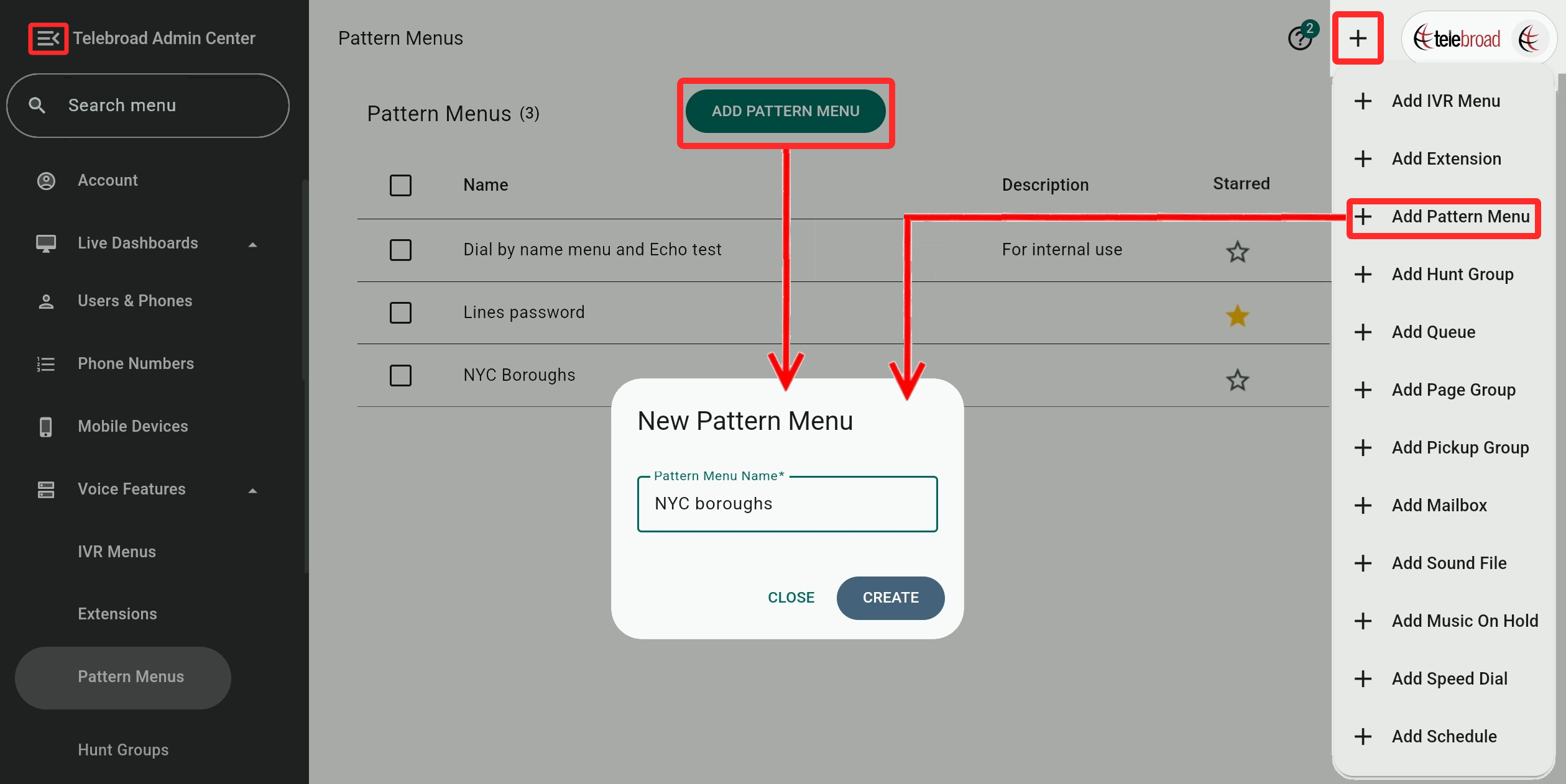 To create a pattern menu, select ADD PATTERN MENU from the Pattern Menus page or the Voice Features Quick menu.