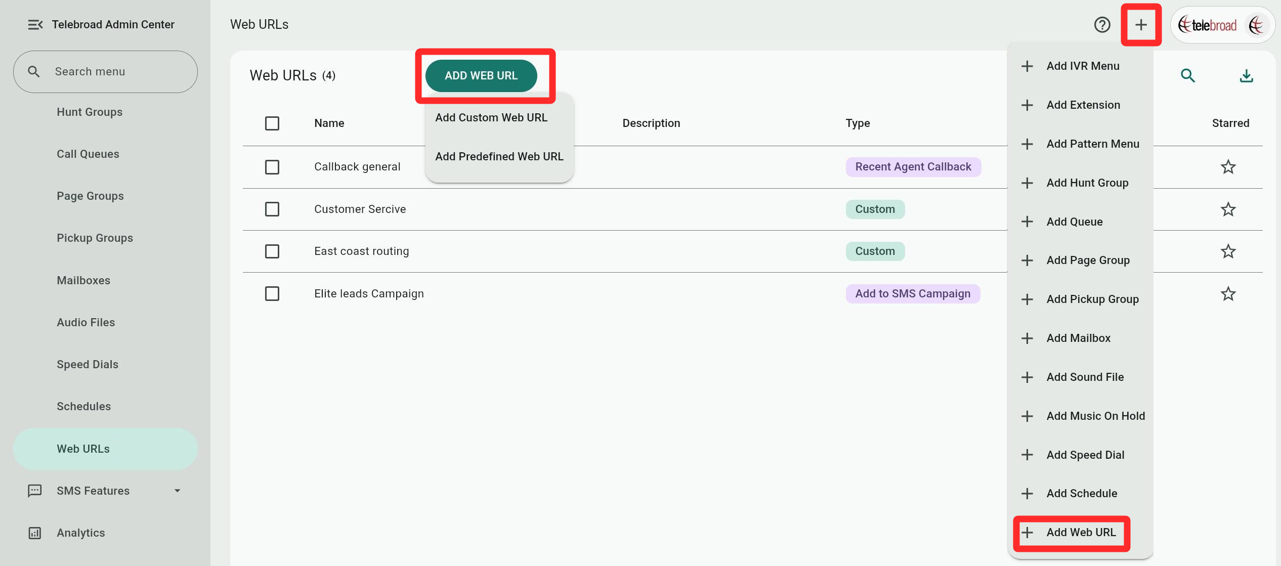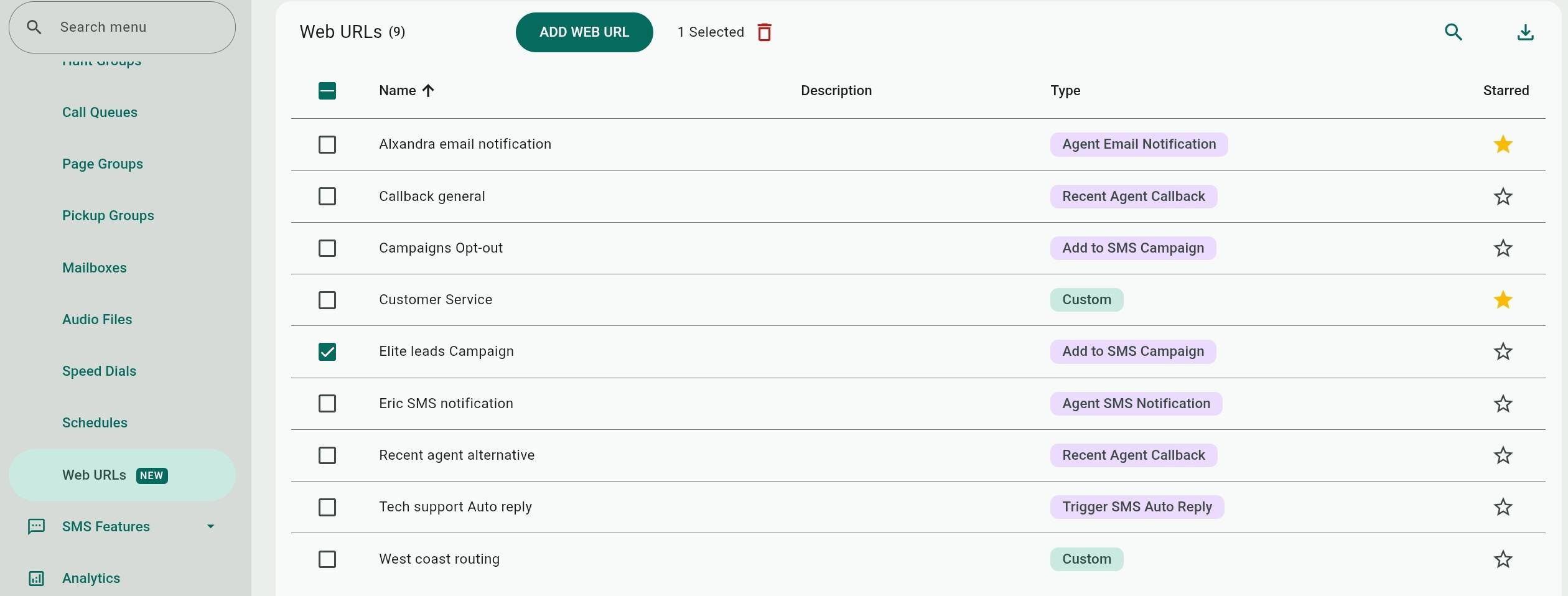 The Web URL page is accessed from the side navigation menu under Voice Features>Web URLs.