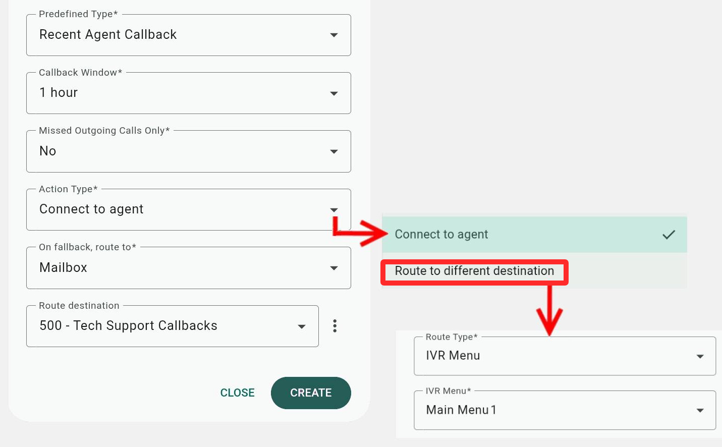 - Route to different destination will connect the caller to an IVR menu or Extension when the system finds a recent call match. This allows you to have other agents or departments handle the call.