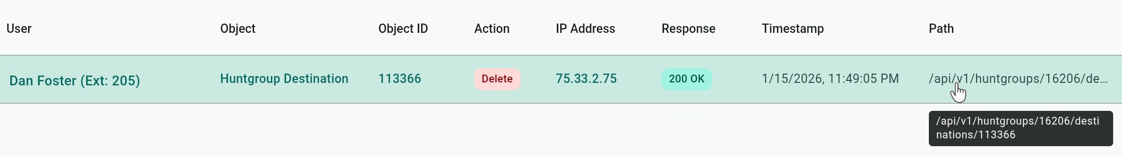 As shown in the sample figure, the path has the Object (Huntgroup Destination) and its ID (113366), and also indicates that this object is a component of Huntgroup 16206.