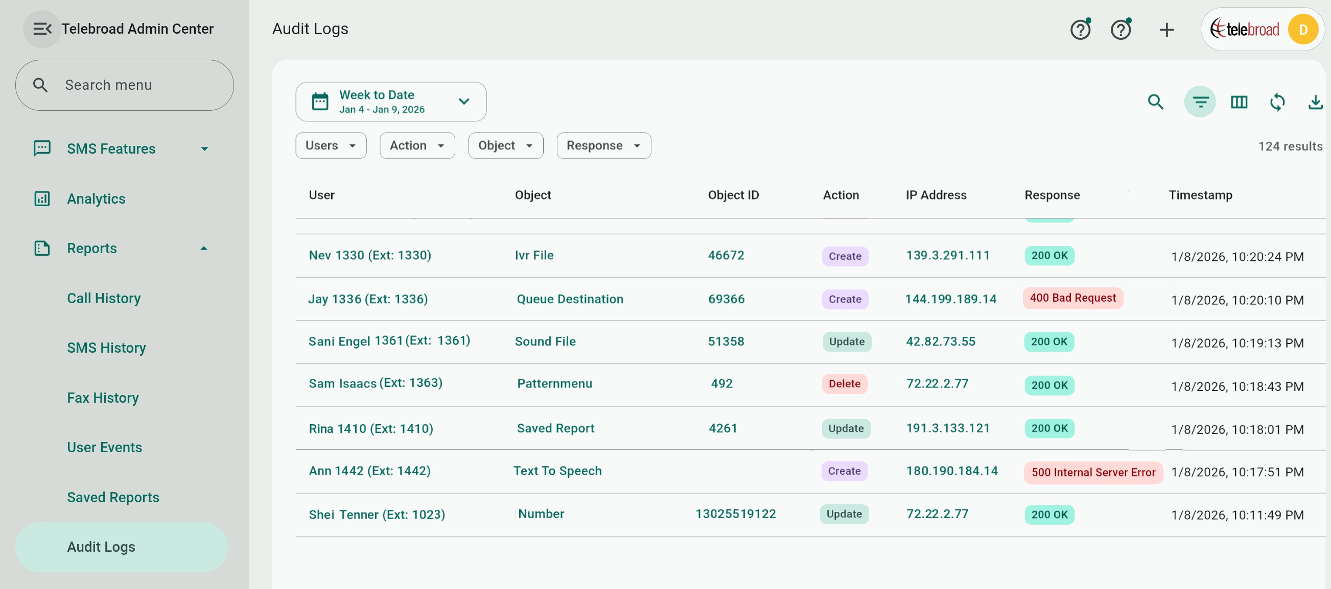 The Audit Logs report is a compliance and security tool that lets you track and monitor all actions and user activity on the Admin center and across the phone system. It lists all creation, updating, and deletion operations, including voicemail deletions, user modifications, and configuration changes.