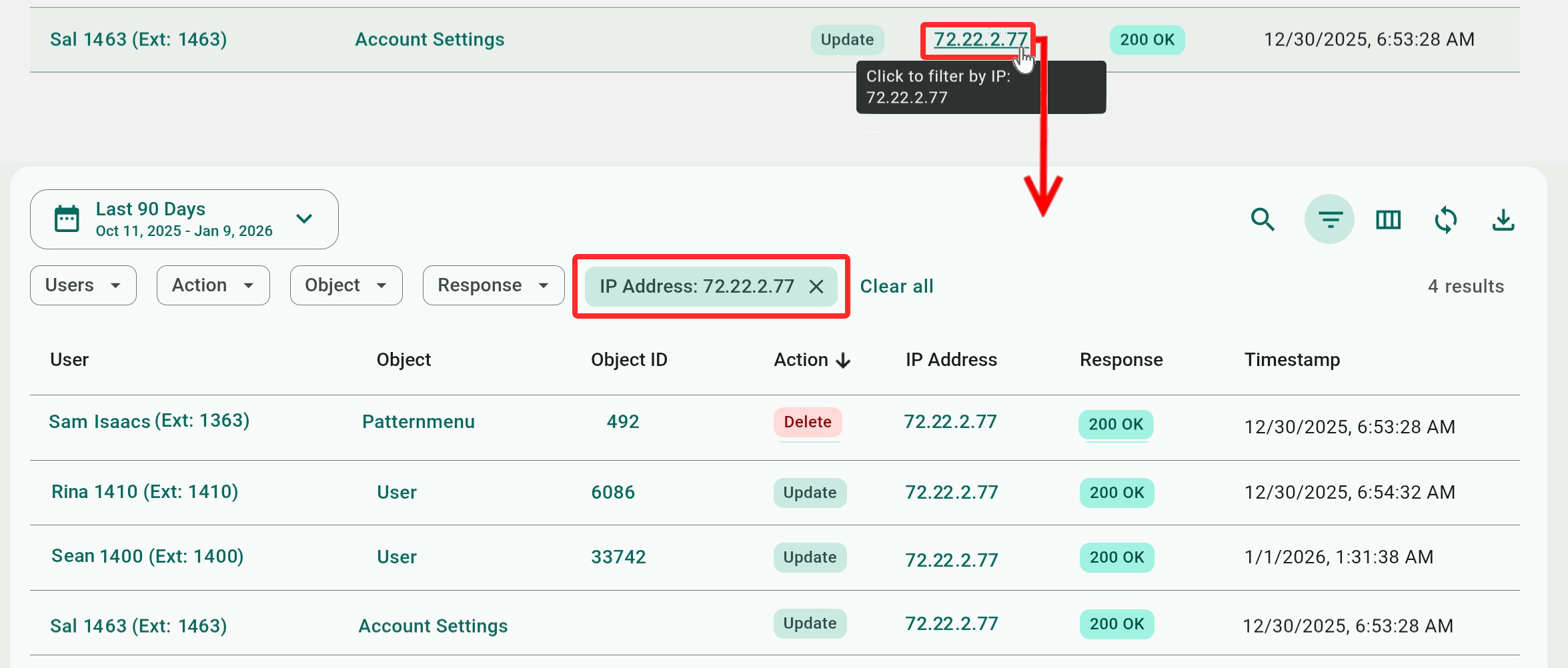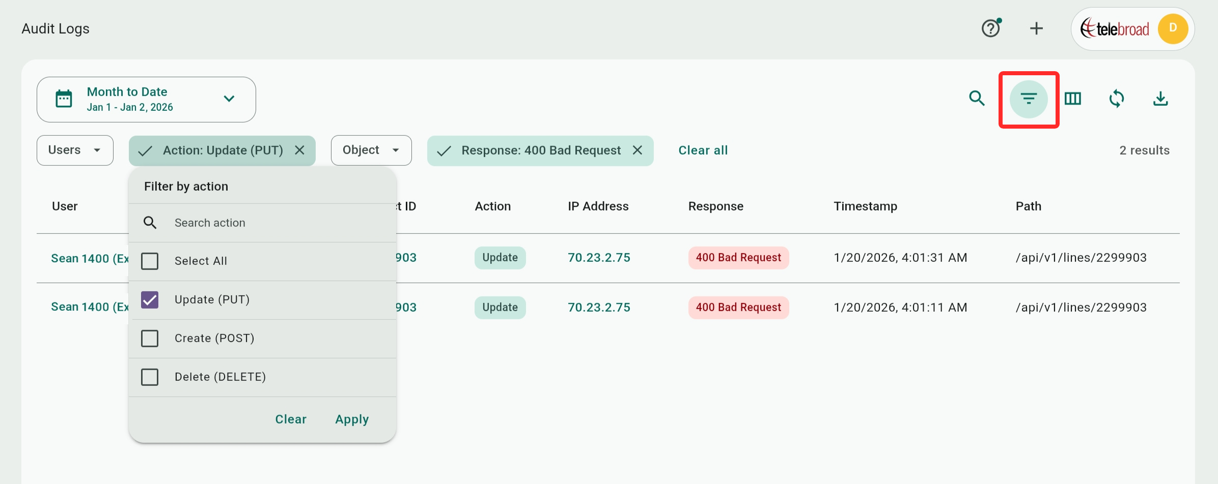 The filter toolbar has four filters – Users, Actions (Create, Update, or Delete), Object, or Response. The Users filters has all the available users on the system. The Object and Response filers will only have choices based on values that are already found in the audit logs.
