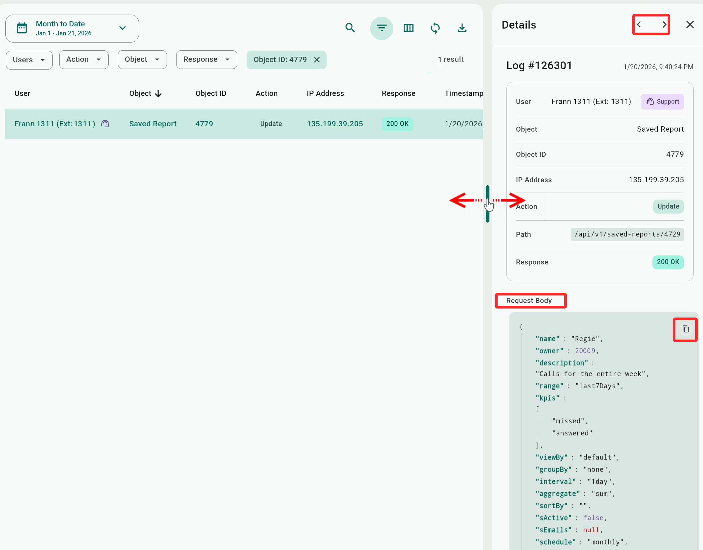 In addition to values from the report columns, the viewer also displays the API Request Body which includes the data and parameters sent to the Telebroad server to process the action, making it educational for developers incorporating Telebroad services into their products.